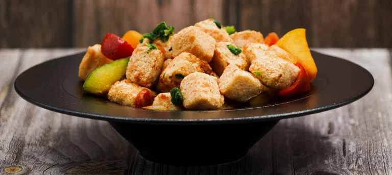 Una combinación fresca y original. El crocante de ralladuras cítricas, almendras y semillas de sésamo envuelve los cubos de pollo aportando textura, aroma y un sabor vibrante.